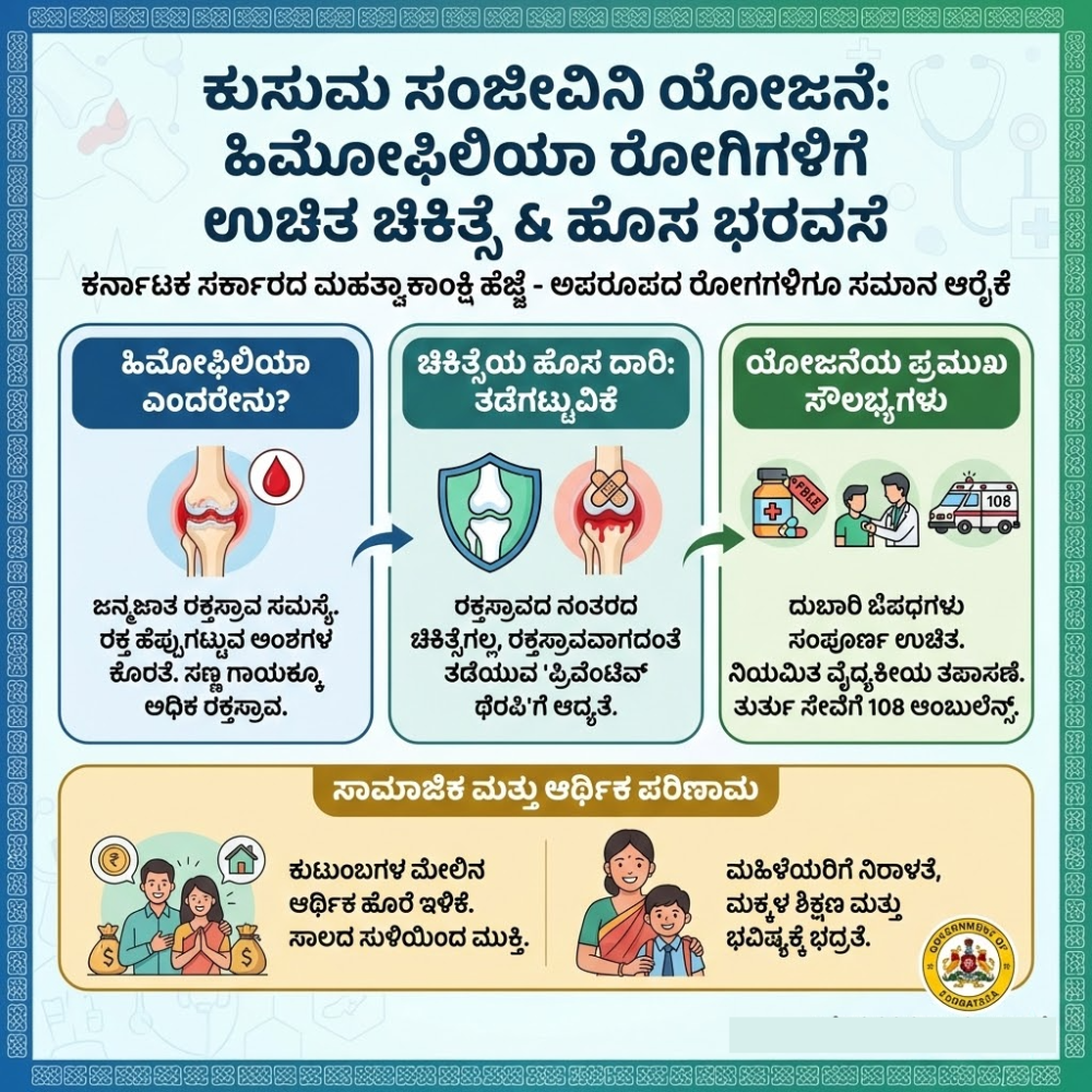 ಆರೋಗ್ಯ ಸಮಸ್ಯೆ ಬಡವರ ಸಮಸ್ಯೆ ಎನ್ನುವ ಕಾಲ ನಿಧಾನವಾಗಿ ಮುಗಿಯುತ್ತಿದೆ. ಕರ್ನಾಟಕ ಸರ್ಕಾರ ಅಪರೂಪದ ರೋಗಗಳಿಂದ ಬಳಲುವವರಿಗೂ ಸಮಾನವಾಗಿ ಆರೈಕೆ ಸಿಗಬೇಕು ಎಂಬ ಸ್ಪಷ್ಟ ನಿಲುವಿನೊಂದಿಗೆ ಹೊಸ ಹೆಜ್ಜೆ ಇಟ್ಟಿದೆ. “ಕುಸುಮ ಸಂಜೀವಿನಿ” ಯೋಜನೆ ಹಿಮೋಫಿಲಿಯಾ ರೋಗಿಗಳಿಗೆ ಕೇವಲ ಔಷಧ ನೀಡುವ ಕಾರ್ಯಕ್ರಮವಲ್ಲ, ಅದು ಬದುಕನ್ನು ಸಹಜವಾಗಿ ನಡೆಸುವ ಅವಕಾಶವನ್ನು ನೀಡುವ ಪ್ರಯತ್ನ.